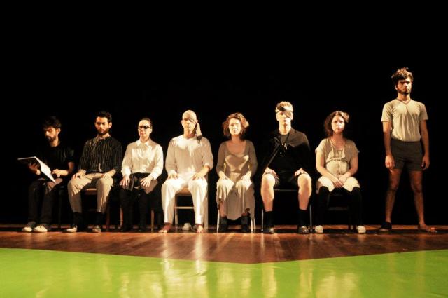 O grupo carioca se coloca nessa posição de olhar de fora uma tragédia contemporânea, ciente de que não tem como acessá-la por dentro sem preencher falsamente vazios que desconhece. A arquitetura do espaço cênico funda esse distanciamento. Enfileirados em cadeiras, os atores, com seus personagens latentes, acompanham a leitura do texto pelo diretor-narrador, até que chegue sua hora de ir ao centro do palco representar. A apropriação da realidade é mediada tanto por essa narração quanto pela intervenção de duas jornalistas, que, tal como o narrador, chegam ao palco vindo da plateia e reafirmando, assim, a conexão do grupo com o real, com a população e a cidade – não apartados na coxia numa arte descolada do mundo.