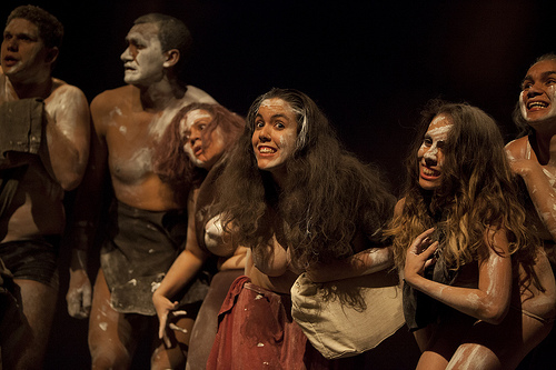 O trabalho tenta dar conta deste inominável na existência humana, como na imagem em que Winnie aparece enterrada até o pescoço de corpos mortos. Mas isso não se propaga para todo o trabalho. A encenação de Héctor Briones aposta como seus pontos fortes na construção de belos momentos imagéticos, em que predominam os focos pontuais de luz, uma permanente quase escuridão, e ganha novos contornos quando integra elementos da dança ao trabalho dos atores. Consegue dar uma unidade ao elenco pela própria natureza do trabalho, fazendo com que todos tenham relevância no desenvolvimento do espetáculo, sempre um grande desafio em um exercício de formação. Porém, algumas vezes, a ideia mal-interpretada de absurdo como “algo tão vago que já nada significa (Ionesco)” é o que permanece ao fim de cada quadro. Ao contrário, cita Marvin Calson em seu “Teorias do Teatro” as palavras de Ionesco, o propósito dessa dramaturgia só se realiza “quando se busca a fonte da existência ou se pretende entendê-la como um todo razoável é que o incompreensível aparece”.