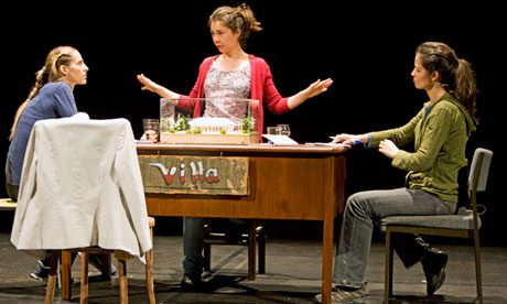 Vale ressaltar, ainda, a composição cenográfica, limitada à mesa com dezenas de copos d’água, metaforizando o falatório e a verborragia dos pronunciamentos e discursos oficiais; e uma maquete de Villa Grimaldi, tão pequena e inofensiva em proporção às atrizes, chegando ironicamente a parecer uma casa de bonecas, símbolo da inocência e da pureza infantil, mas habitada pelos traumas sanguinolentos de um país. Ao fim da peça, após o pronunciamento de Bachellet, as luzes se apagam e as pequenas janelas da maquete se acendem, ao mesmo tempo em que um som grave e crescente faz tremer a mesa, os copos, a maquete, os corpos dos presentes. Este sismo materializa a tremulação da obra, o abalo das ideias postas sobre a mesa, das ideologias dominantes e dominadas. O terremoto, fenômeno geográfico tão marcante no Chile, faz trincar o verbo, causando o grande abalo e a comoção violenta. É o movimento do que está sob nós, transformando a paisagem, disparando os alarmes da ordem.