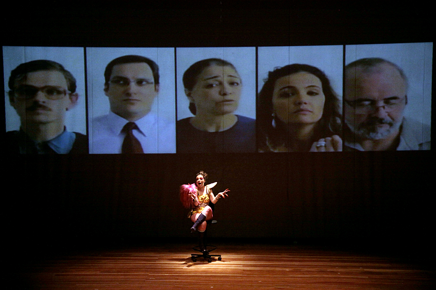 O eu – representado pela atriz Janaina Matter – se apresenta carnal, palpável, presente. Uma mulher cujas inquietações de uma noite de tédio a levam a romper o protocolo da reunião de condomínio vestindo traje carnavalesco. Seu discurso é carregado das frases-sínteses do existencialismo – entre as quais, “o inferno são os outros” e “estamos condenados à liberdade”. Seu figurino, ousado nas unhas agressivas e nas misturas de texturas dos tecidos. A potência à qual alude é de uma transgressora.