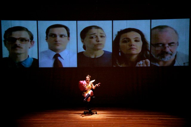 Pois vamos aos outros. Trazidos ao palco em vídeo e, como observado pela debatedora Lucienne Guedes, maiores que a personagem e posicionados acima dela no espaço cênico, eles esmagam a presença da atriz, desfavorecida também pela luz insuficiente sobre si. Essa relação desmedida, se intensificada, pode ter seus sentidos incorporados à criação, reiterando o peso dos outros sobre o eu. Na cena, o que se vê é uma interação rica em detalhes e rigorosa nos tempos, mas na qual a afetação entre as partes é enfraquecida. A certa altura, no meio da cena, o vídeo toma o protagonismo e a personagem pouco reage, relegada à condição de espectadora também. Pela natureza do registro audiovisual pré-gravado tal como apresentado, o universo dos outros se torna evidentemente impermeável. O atrito entre individualidades se dilui num aparente determinismo pessimista de que não há possibilidade real de afetação.