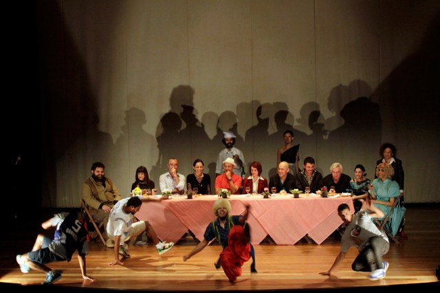 Mais além desse encontro das diferenças restritas a um segmento tão específico quanto o teatro instituído na cidade, o coletivo opera um confronto entre as forças da dita alta cultura, porque legitimada em espaços como mostras e edifícios teatrais, e a dita baixa cultura, afastada das atenções da crítica e da academia. A entrada de b-boys, com rigor físico e energia incomparáveis, desestabiliza as noções de arte superior ou inferior, ao mesmo tempo em que o fato de se apresentarem em um palco lhes confere a legitimidade negada na rua. Contudo, é sintomático que os dançarinos não se sentem à mesa com os demais – a relação com eles ainda não é de comunhão, são os “outros”.