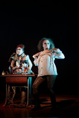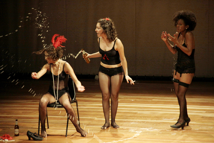 Dessa maneira, a cena absorve alguns dos questionamentos predominantes em produções teatrais contemporâneas, tal como o embaralhamento entre o real e o ficcinal, o metateatro e a relação com o audiovisual, vulgarizando seus usos no desbunde da decadência precoce. A reconhecida carência do propósito artístico – ironicamente ou não, as artistas se detêm naquilo de que debocham – estabelece os limites da dramaturgia.
