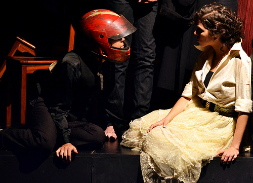 Os pontos de intersecção entre a obra da Cia. dos Atores e do Tarja já começam pelo espaço cênico. Os atores estão em cena, numa espécie de arena, quando o público entra. Cadeiras e outros elementos contemporâneos (óculos escuros, guitarra, capacete) e referências pop (como a maquiagem escorrendo pelos olhos) preenchem o espaço. A relação que estabelecem com o texto também é muito similar, atualizando-o, comentando-o, ironizando-o. “Você acredita em Hamlet de cavalo branco?”. As semelhanças continuam ao longo da encenação (a forma como a música e a água são utilizadas no afogamento de Ofélia, os atores lendo trechos da peça, espada de desenho animado, lembrando o Power Rangers…), mas citá-las todas aqui seria um exercício exaustivo e desnecessário – até porque esses pontos de contato estão nos olhos de quem vê, no caso, os meus.