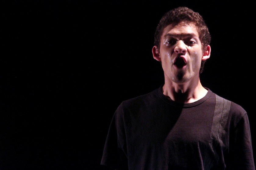 A atuação, porém, não atinge a dimensão de estranhamento dos sons e das frases. Embora se perceba um trabalho sobre as emissões vocais, sem uma qualidade de invocação as falas não realizam a performatividade possível do texto. A coreografia de oposições e aproximações entre os dois corpos dos atores, sobre plataformas baixas, tampouco evidencia as intensidades e os deslocamentos forjados no nível da fala.