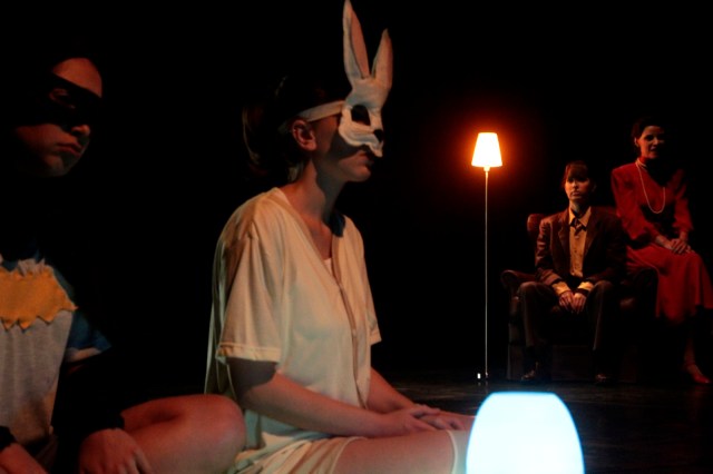 A analogia com o quadro se estende às máscaras de longas orelhas usadas pelas crianças. Elas se vinculam à proposição de que a natureza (irracional) é mais forte, professada em um noticiário trágico intermitente. Os filhos, nesse sentido, estão mais perto da natureza animal do que os pais, já culturalmente moldados. O que não impede de a irracionalidade dominar os adultos também: seja pela violência ou pela sexualidade. É notável que o fato de uma das crianças “aprender” uma nova língua, inventada, acena também para esse processo de aculturação que formata uma ideia de sujeito.
