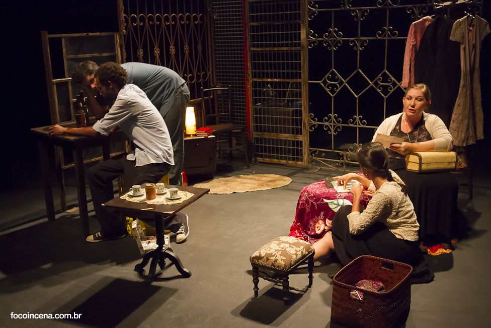 Sobre essa elaboração narrativa da personagem, contudo, o grupo dispõe mais uma camada mediadora: dedica-se à desconstrução da cena, sabotando a possibilidade de o espectador aderir completamente à narrativa. Para tanto, usa os tais ruídos e quebras, que operam sobre o tempo e sobre a lógica (a entrada anacrônica de um celular; a Fanta servida como chá; etc). Mais do que isso, escancara o processo de construção do espetáculo trazendo à vista das atrizes e do público os agentes de luz e de som. Nesse sentido, radicaliza em relação à cena curta, permitindo que eles extrapolem suas funções e surjam em cena também como atores, reafirmando, assim, o caráter artificial e de construto do que é apresentado.