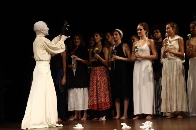 No dia seguinte, a Casa da Ópera completamente tomada para assistir à encenação. Yoshito surge em cena em trajes femininos, a face pintada de branco, deslocando-se de forma quase a flutuar pelo espaço vazio. Entre uma entrada e outra do mestre japonês em cena, os participantes da oficina faziam no palco aquilo que vivenciaram no dia anterior: a flor, o papel, a seda, a dança da lua.