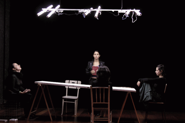 Começamos o processo em sala de ensaio no inicio de 2010. Estreamos em julho deste ano e cumprimos duas temporadas, uma em setembro e outra em dezembro de 2010. Em 2011, segui estudando a peça como objeto de análise dentro de uma pesquisa desenvolvida dentro da UFRJ com orientação da professora e artista plástica Livia Flores. Em 2012, fomos chamados a ocupar a sede da Cia. dos Atores, realizando a terceira temporada. E no segundo semestre, participamos da Mostra Hífen de Pesquisa-Cena, realizando a quarta temporada exatamente dois anos depois da estreia. Escrevo sobre a nossa trajetória porque a cada temporada aprendemos mais sobre a peça e entendemos mais do que ela é feita e de como se manifesta. Ou seja: sua expressão ainda é um mistério e faz parte de Miranda a dificuldade em prender, segurar, fechar, firmar, entender… Por isso, nas duas últimas temporadas, em 2012, entendemos entre nós que Miranda é menos peça de teatro e mais performance. Não que essas classificações importem, mas, conceitualmente, nos limitam e libertam ainda mais. Quero dizer: o nosso referencial de performance é menos da sala preta e mais da vida (são artistas inúmeros que fazem de seu próprio corpo a obra, o protesto, o sentido…). A performance começa em você, no corpo do performer, e tal como ela, nosso espetáculo foi cada vez mais solicitando às atrizes a doação completa do seu corpo e da sua presença. No entanto, queríamos ainda contar aquela história, apresentar aquela situação primeira (das atrizes e do diretor tentando encenar a obra de Beckett). Nesse sentido, nos vimos num paradoxo: queríamos o nosso corpo e a nossa voz, mas tínhamos que inseri-los numa ficção, numa peça, com outras falas e opiniões que não somente as nossas. Nesse sentido, fomos assimilando que a presença que a linguagem da performance pode trazer ao ator poderia também ser usada num palco, dentro da estrutura dramática de uma ficção, de uma dramaturgia. Para além do corpo, da fala, a performance é uma força que presentifica aquele que se dispõe a estar. Por isso dizemos que a peça nos fez descobrir a performance enquanto ficção. Porque mesmo tendo um espetáculo com texto fechado, encontramos diferenças a cada apresentação, por conta da presença honesta e radical que o trabalho com a performance foi capaz de nos dar. Qualquer ficção, qualquer mentira ou invenção pode ser sincera, desde que expressada por um corpo que se disponha à sinceridade do encontro.