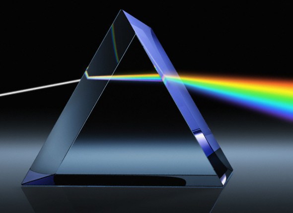| A luz branca refratada em suas cores espectrais quando incide sobre o prisma. |