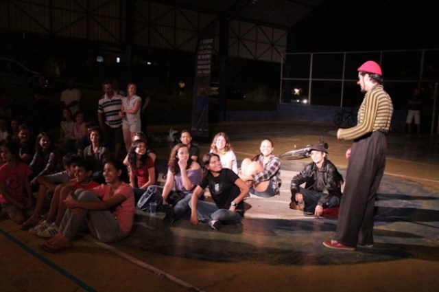 Mas, dizem que, para o teatro acontecer, basta haver alguém que faz e um outro alguém que vê, mesmo que tudo conspire contra. Se o fazedor for um palhaço e o espectador uma criança, não há tempestade, falta de cadeira ou distância que impeça o convívio de acontecer. É o que comprovou a apresentação dos músicos-palhaços do Grupo Dona Zefinha, que veio de Itapipoca (CE) para mostrar “O Circo Sem Teto da Lona Furada dos Bufões” na programação do XX Festival Nacional de Teatro de Presidente Prudente.