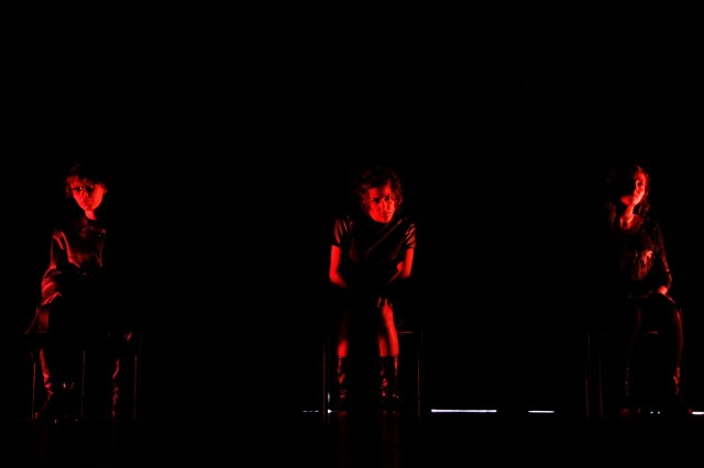 A encenação encontra momentos de instauração, em que imagens-síntese parecem se estabelecer, como a cena citada por Marcio Abreu na conversa após o espetáculo, em que a mobilização de uma luz verde incidindo sobre o corpo desenhava uma silhueta indefinível, e a cena em que as três atrizes, caminhando para frente em direção à plateia, projetam formas no fundo da cena criando sombras que parecem oprimir o espectador. Nestes momentos, não há apenas uma inversão do estabelecido, mas sim um desenho não-identificável da condição humana (feminina ou não) que parece se desvelar.