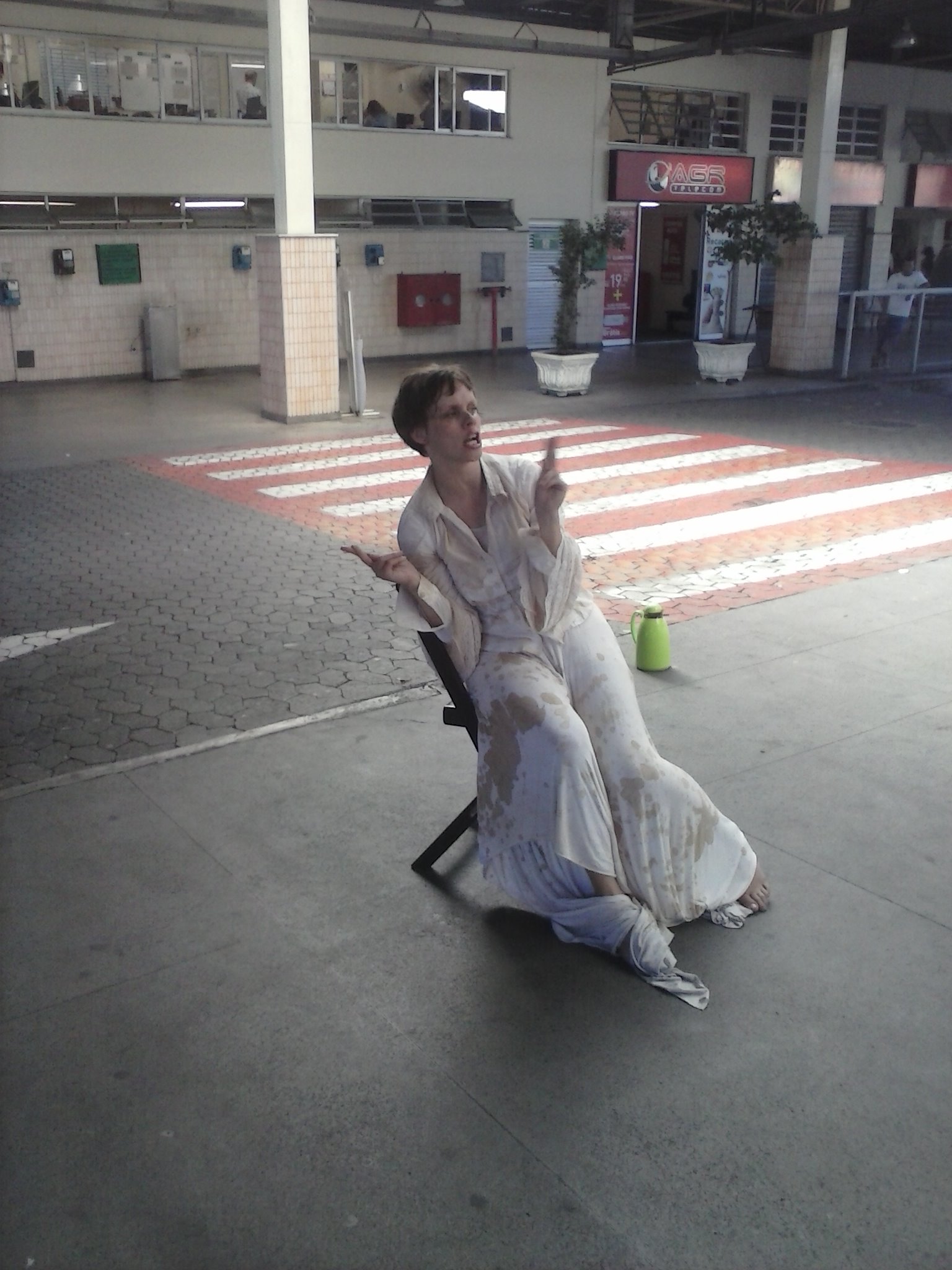 A programação de rua do 12º FIT-BH começou na manhã de quarta (7), às 9h, esvaziada e silenciosa. Em vez de um espetáculo mobilizador de multidões, viu-se a intervenção solitária da atriz Tatiana Lenna na Estação BH Bus de Venda Nova. Sentada em uma cadeira, ela tentava atrair a atenção dos passantes manchando com gotas de café as vestes brancas. Tal como Estamira (levada ao teatro pela carioca Dani Barros), sua personagem é uma mulher intelectual e psicologicamente abalada, capaz de proferir ideias incomodamente lúcidas em sua deficiência lógica.