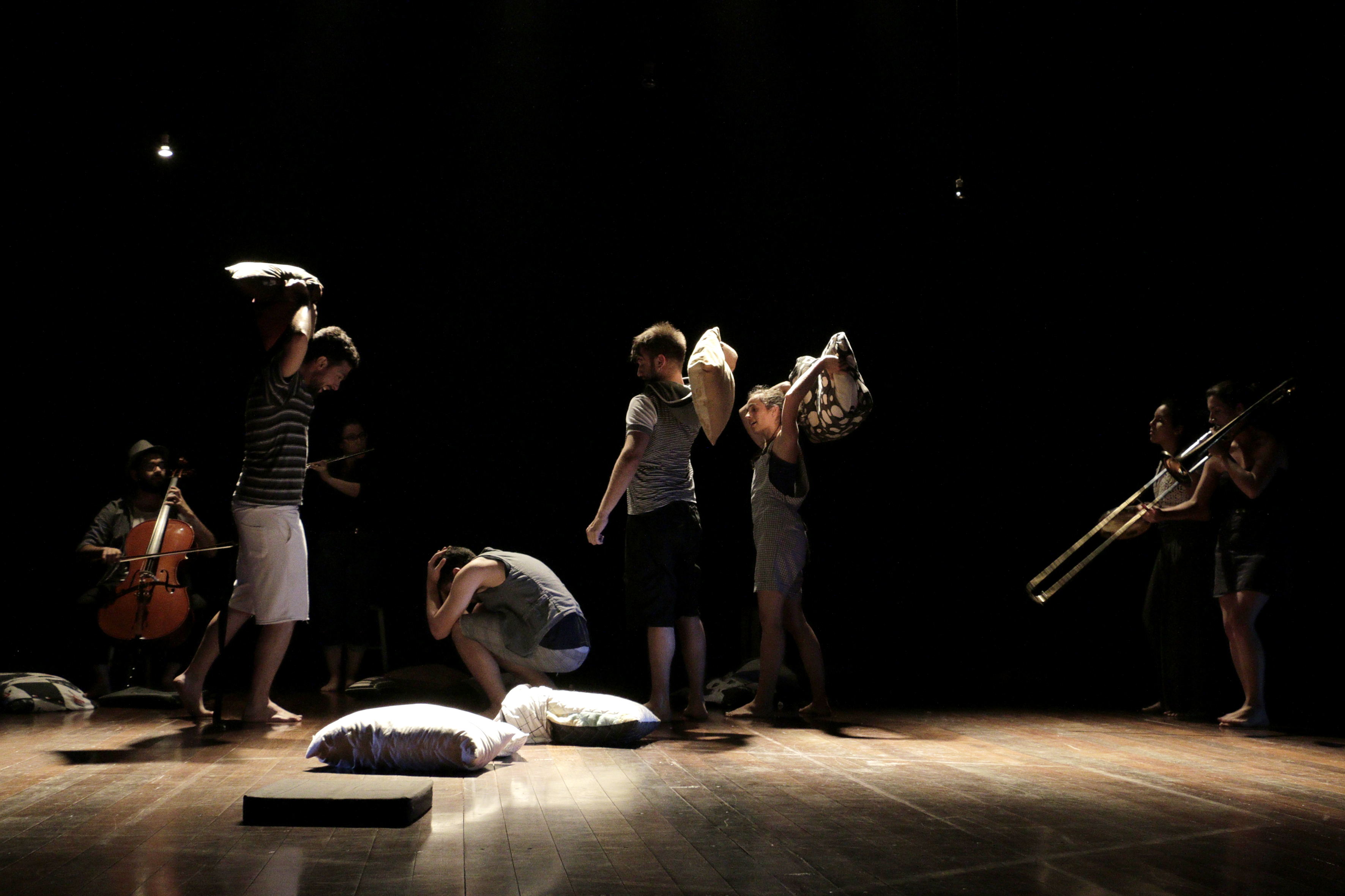 Ainda que promova ações festivas e intensificadoras do convívio, como uma guerra de almofadas e uma banda em cena, a peça enfrenta dificuldades em gerar experiência, advindas, em parte, de imprecisões na execução das cenas e das intervenções musicais, e da qualidade de fala dos atores. O jogo de almofadas, por exemplo, afeta fisicamente o fôlego deles, prejudicando o entendimento do que dizem. Falta presença e mais consciência das intenções para que as cenas ao fundo do palco atravessem o espaço e afetem o espectador.