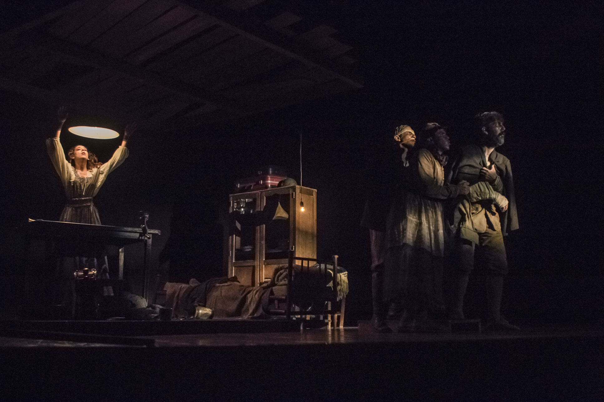 A “fábula” da situação proposta por Brecht – em que quatro soldados desertores se veem confinados sob a “liderança” de um deles – é transformada em plataforma para a construção de desenhos no espaço; para a criação de jogos entre os corpos que se submetem, violentam e subjugam; para a dissolução da linguagem como veículo de sentido. Os elementos do texto original permanecem lá – o confinamento, a busca pelo alimento, as “tentativas” de consenso, a figura feminina –, mas são apresentados de maneira tão sintética e instável que funcionam apenas como sugestões, e delegam ao espectador o exercício de também aceitar as lacunas.